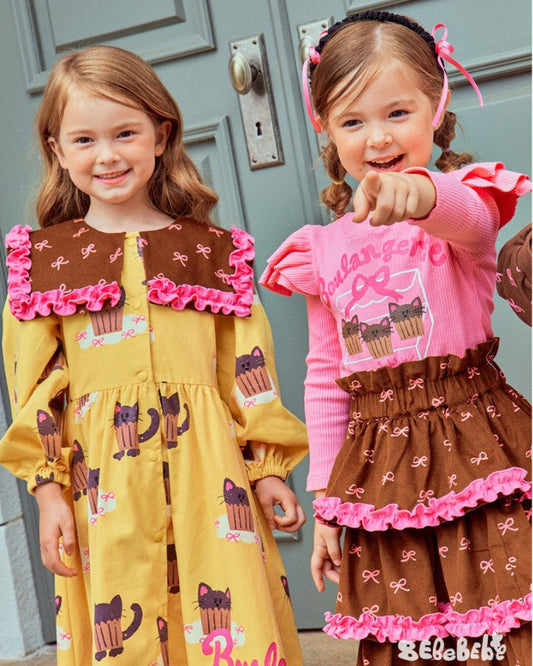 Girls Ruffle Party Dress Set Cupcake Cat Print Long Sleeve Top & Layered Skirt Birthday & Holiday Outfit