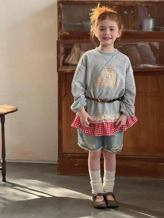 Teddy Sweetheart Gingham Ruffle Sweatshirt - Heather Grey