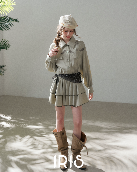 Embroidered Waist Tie Shirt Dress – Grey