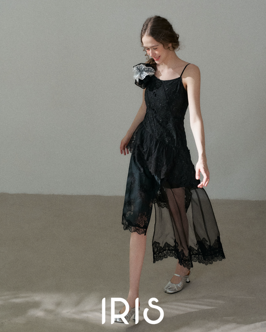 Black Lace Spliced Asymmetric Dress