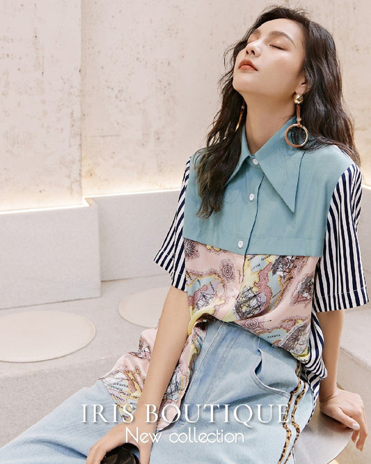 Vacation in HK |Patchwork Contrast Shirt