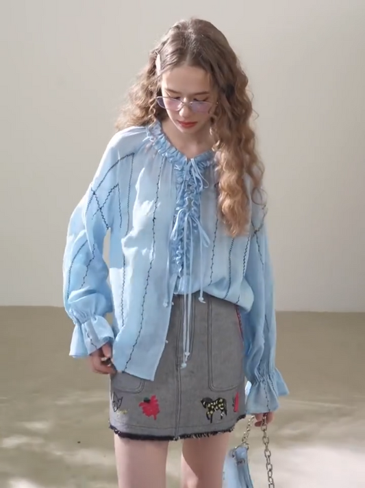 Soft Cotton-Linen Ruffle Tie Blouse