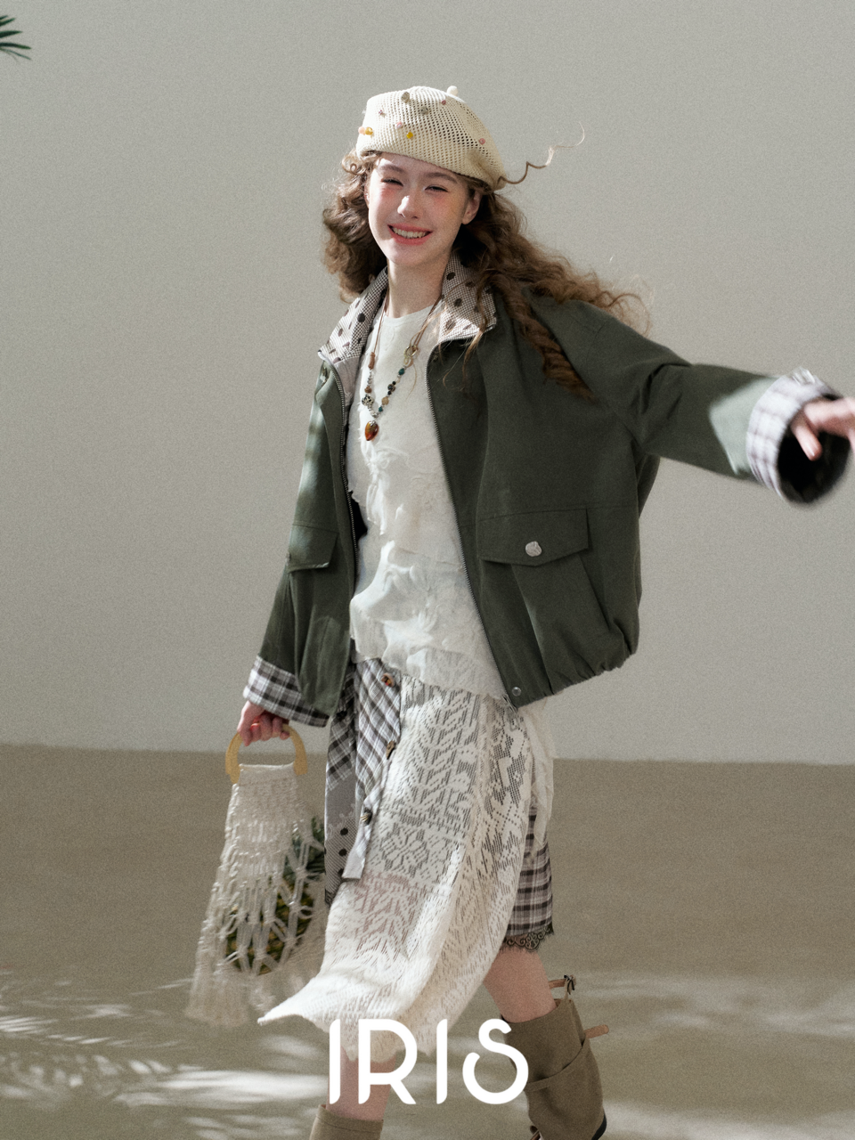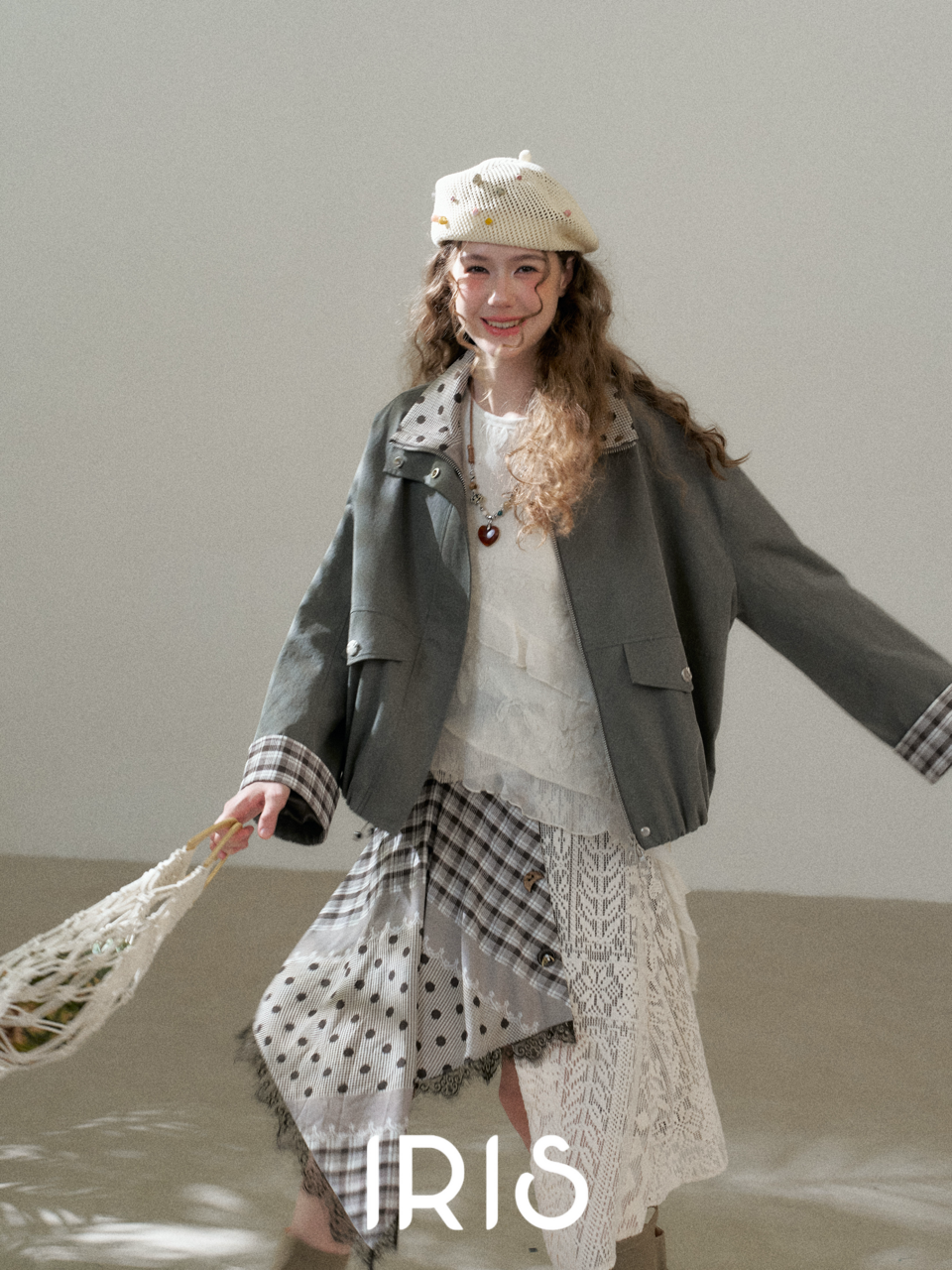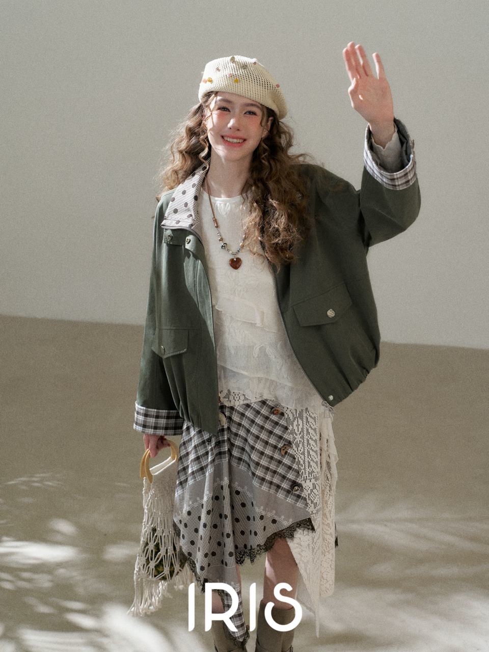 Contrast check fabric accents at the collar and cuffs add subtle dimension, offering modern character with easy styling versatility.